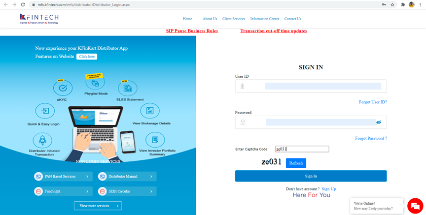 On Karvy Distributor Login page, user to enter registered user id, password and click on <Sign In> button.
